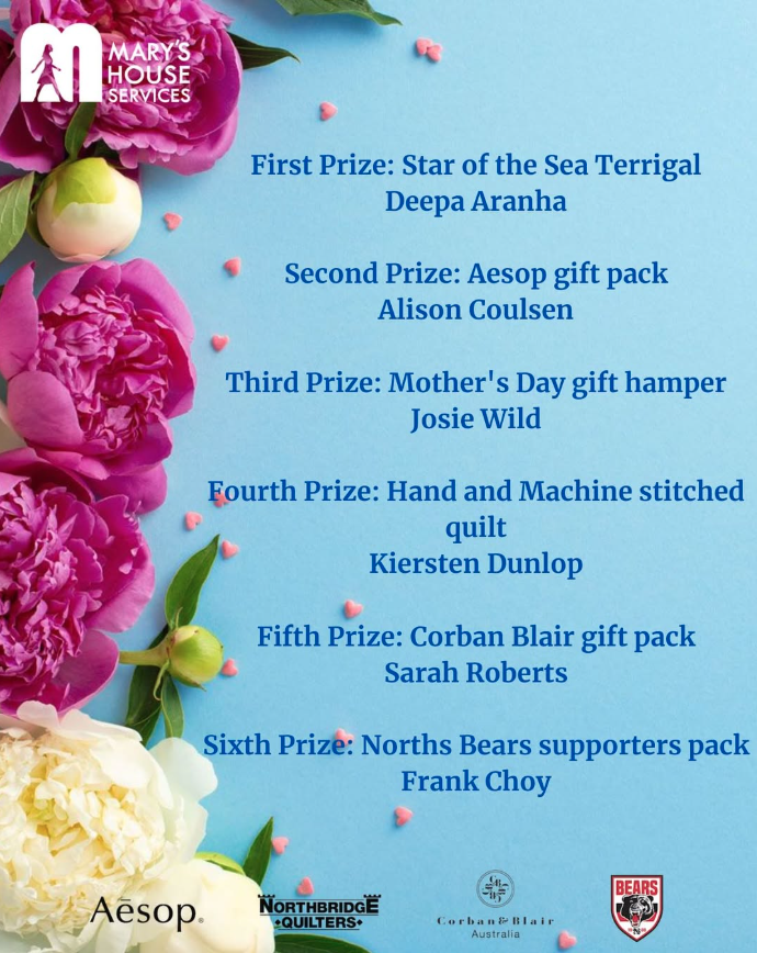 Congratulations to our Mothers Day raffle prize winners and thank you to everyone who bought a ticket, your support means we are able to offer safety, hope and critical care to victim survivors of domestic and family violence. Thank you for supporting our work. Thank you also to our committed and generous prize donors who make our raffles possible.