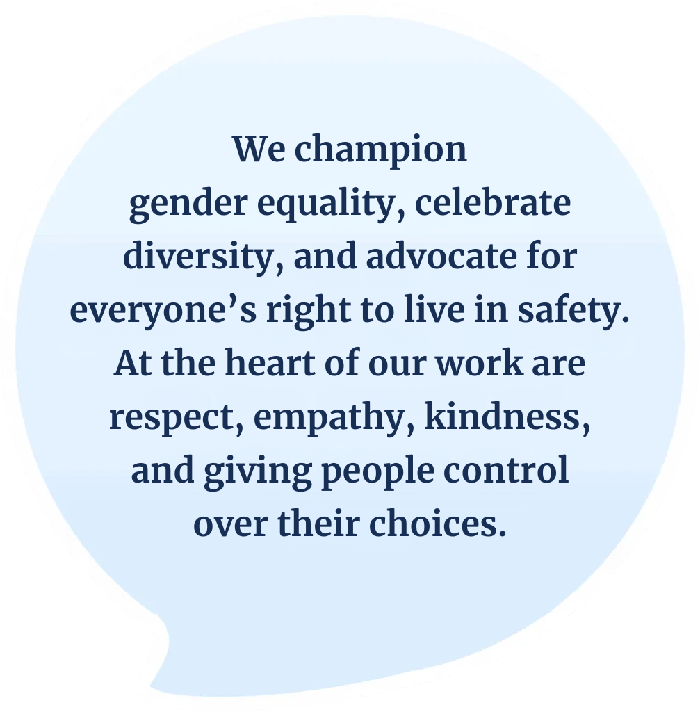 We champion gender equality, celebrate diversity, and advocate for everyone’s right to live in safety. At the heart of our work are respect, empathy, kindness, and giving people control over their choices.
